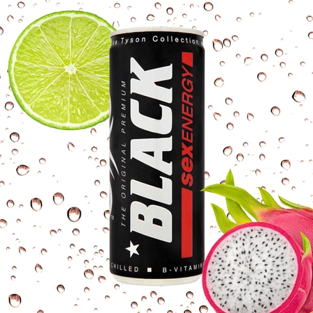 - Black Sex Energy to energetyk o intensywnym, egzotycznym smaku – połączenie pitahaya, grenadiny i limonki tworzy unikalne i orzeźwiające doznanie smakowe. Zawiera taurynę (0,35 %), kofeinę (0,03 %) oraz kompleks witamin B.