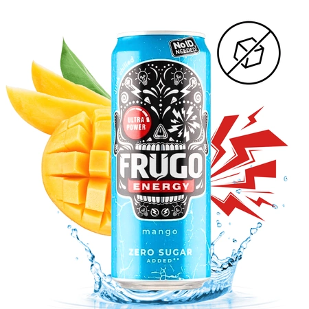 - Frugo Energy Mango to gazowany napój energetyczny o orzeźwiającym smaku mango. Bez dodatku cukru (wersja Zero Sugar), z nutą naturalnej kofeiny (pochodzącej z liści yerba mate), dzięki której zyskujesz zastrzyk energii bez dodatkowych kalorii.
